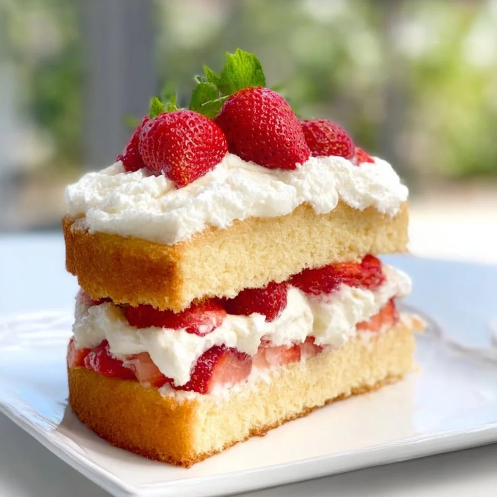 Serve this delightful treat on a bright-colored plate for that extra pop! Consider adding a sprig of mint for color and a punch of freshness. The aroma of sweet strawberries mixed with whipped cream is irresistible, and those vibrant red strawberries against the light brown cake are pure eye candy.